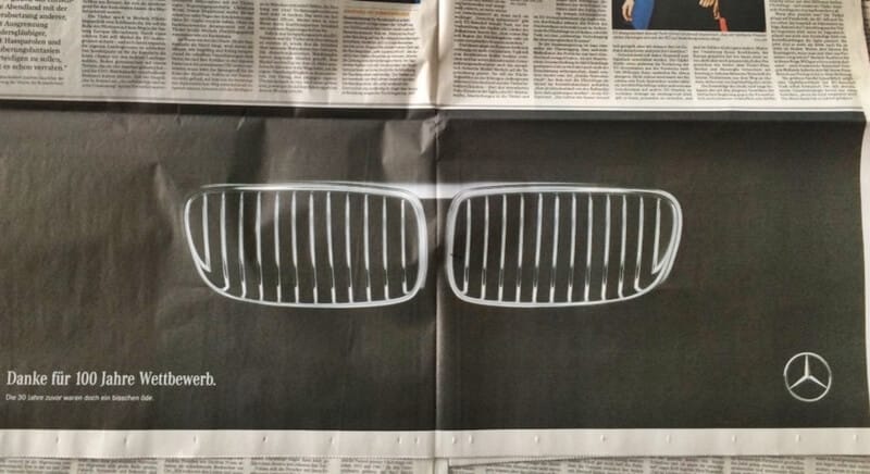 İşte tam bugün, Mercedes-Benz firması Alman gazetesinde yayınlamış olduğu ilan ile rekabet dolu geçen 100 yıl için BMW firmasına teşekkür ediyor. Hem ilanda hem de Twitter hesabı üzerinde paylaşan Mercedes-Benz firması ilan metninde "100 yıllık rekabet için teşekkürler, ilk 30 yıl biraz sıkıcıydı." yazıyor. Yayınlanan bu metinde ise Mercedes rakibi BMW'ye 30 yıl daha eski bir marka olduğunu değdirmekten de kaçmamış oluyor.
