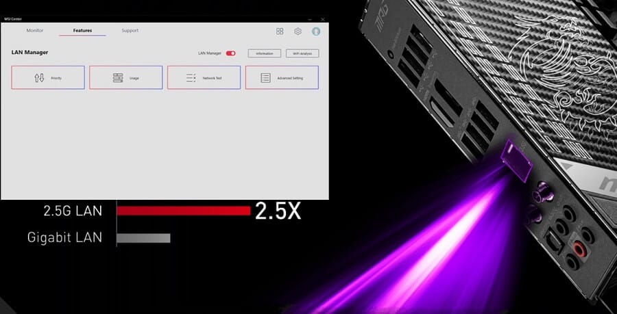 2.5G LAN: Gelelim bağlantılara. MSI MPG Z590 GAMING CARBON WIFI kablosuz bağlantısı ile öne çıktığı gibi LAN bağlantısıyla da öne çıkmakta. Bunun için 2.5 Gbps LAN desteği sunuluyor. Birinci sınıf bir veri aktarımı sağlanmakta. Yüksek bant genişliği ve çok düşük gecikme süreleri avantajı var.