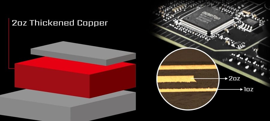 2 OZ Kalınlıkta Bakırlı PCB: MSI MPG Z590 GAMING CARBON WIFI, hız aşırtmayı seven kullanıcıları da düşünmüş. Bunun için gelişmiş bir PCB tasarımına yer vermiş. Isı dağılımının en güvenli şekilde yapılması ve kararlı bir performans sunulması adına iletkenlik arttırılmış bir yapı kullanılmış.