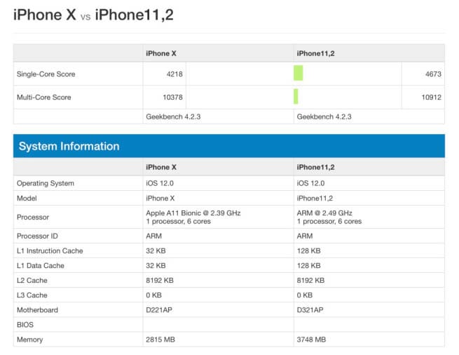 Geekbench test sonuçları ile son amiral gemi iPhone X'in test sonuçları karşılaştırıldığında ise ortaya %10 diliminde bir performans farkı çıkıyor. Tek çekirdekteki karşılaştırmada yüzde %10, çok çekirdek performansında ise fark %5 olarak ölçümlenmiş durumda. Öte yandan yeni işlemcinin çok daha tasarruflu olacağı ihtimali de bulunuyor. Zira her yeni işlemci performansı arttırırken aynı zamanda güç tüketimini de azaltıyor.