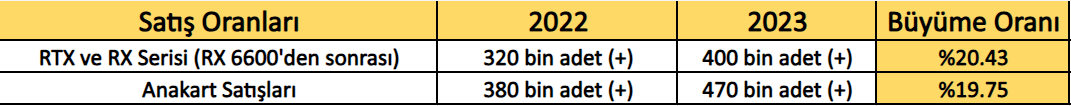 - Anakart satışlarında ise 2022 yılı ile 2023 yılı kıyaslandığında ortalama %19-20'lik bir artış söz konusu.