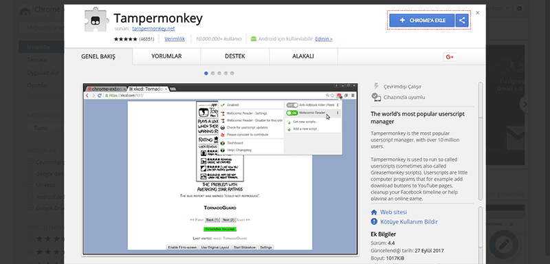 Tarayıcınıza uyumlu Tampermonkey uygulamasını tarayıcınıza ekleyin. (Google Chrome linki)