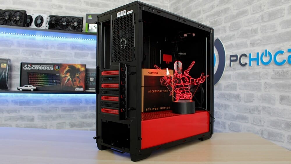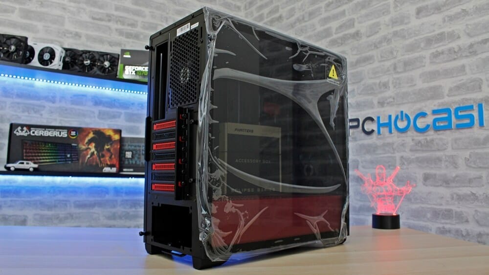 Ve sıra geldi sistemimizin son üyesi, parçaları bünyesinde toplayan kasamıza. Kasa tercihimiz Phanteks Eclipse P400S modeli oldu. Siyah çelik malzemeyi kırmızı ızgara ve iç detaylarla destekleyen, Mid Tower bir tasarım ile oluşturulan kasamızın bir diğer dikkat çekici özelliği ise güçlendirilmiş temperli cama sahip olması.