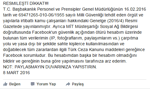 T.C. Başbakanlık Personel ve Prensipler Genel Müdürlüğünün 16.02.2016 tarih ve 69471265-010-06/1955 sayılı Milli Güvenliği tehdit eden örgüt ve yapılarla irtibatlı kamu çalışanları hakkındaki Genelge (2016/4) Resmi Gazetede yayınlanmıştır. Ayrıca MİT Müsteşarlığı Sosyal Ağ Bildirgesi doğrultusunda Facebook'un güvenlik açığından ötürü hesabım üzerinde bulunan tüm verilerimin (IP, fotoğraflarım, paylaşımlarım vs.) çarpıtma yolu ve yasa dışı bir şekilde sahte kişilerce kullanılmasından ve doğabilecek tüm zararlardan ilgili Türk Ceza Kanunu maddeleri gereğince Facebook sorumludur. Bu hesabımdan başka bir hesabım olmadığını bildirir ve gereğinin buna göre yapılmasını tarafınıza arz ederim.