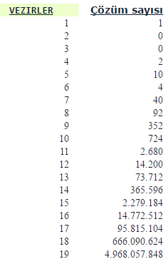 Problemin Çözümü: 8*8 satranç tahtası için 92 farklı çözüm bulunmaktadır. Aşağıda farklı vezir sayıları için kaç farklı çözüm olduğunu görebilirsiniz.