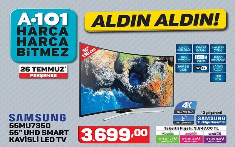 2008 yılında hizmete açılan perakende marketler zinciri A101, iddialı fiyatlar ile teknolojik ürünler satmaya devam ediyor. Mağaza, yakın zamanda güncel teknolojilerle donatılmış bir televizyonu satışa çıkartacağını ilan etti. Piyasanın hemen hemen 1000 TL altına satılacak olan Samsung 55MU7350 model akıllı televizyon, 4K çözünürlük değeri ve HDR desteği ile öne çıkıyor.