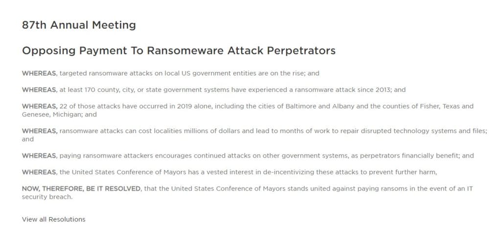 Karar, Haziran ayı sonlarında ve Temmuz ayı başlarında Honolulu'da gerçekleştirilen ABD Belediye Başkanları Yıllık Toplantısı'nda kabul edildi. Kararda, "Amerika Birleşik Devletleri Belediye Başkanları Konferansı, BT güvenlik ihlali durumunda fidye ödemeye karşı birleşme kararı aldı."Bu, ABD genelindeki şehir liderlerine bilgisayar korsanlarına karşı bir miktar kaldıraç sağlayabilir. Toplantıya katılan 227 belediye başkanı kararı kabul etmeyi kabul etti, ancak ABD Belediye Başkanları Konferansı 30 binin üzerinde nüfusu olan 1.400'den fazla şehri temsil ediyor.