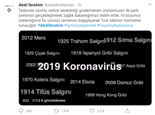 Abdi İbrahim, Koronavirüs için önerilen ilacın üretimine başladı. Yapılan açıklamaya göre üretilen ilk parti üretimi de gerçekleştirerek Sağlık Bakanlığı'na teslim edildi.
