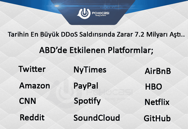 Cuma günü ABD'ye yapılan DDoS saldırısı ünlü şirketlerin kapısını çalmış ve büyük zararlar ortaya çıkarak erişimlerde sorunlar yaşanmıştı. Hatta hükumete ait olan pek çok site çöküşe geçtiği gibi, ABD borsada da büyük kayıplar yaşadı. Daha önceden sizlerle aşağıdaki grafiği paylaşmış ve etkilenen köklü siteleri listelemiştik. Toplamda 35 farklı büyük site hedef alındığı gibi, ülke genelinde internet sorunları patlak vermişti.