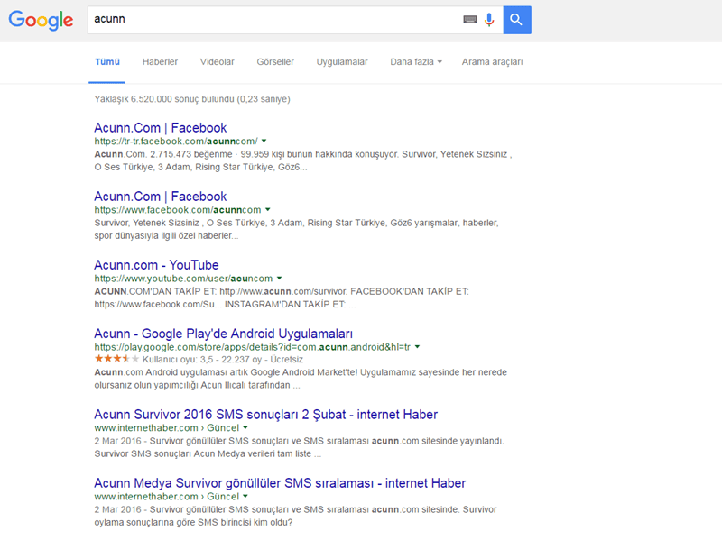 Hatırlayacak olursanız Google bundan 4-5 ay önce Hürriyet, NTV ve Mynet gibi siteleri de kancasına takarak algoritma güncellemelerinden geçirmiş, doğru sonuçları sunmayan web sitelerini arama sonuçlarından ve Google News servisinden kaldırmıştı. Şimdi de Acunn.com web sitesi Google aramalarında karşımıza çıkmıyor. Normalde Google arama motorunu açıp sadece "Acun" yazdığınızda en üst sırada görünen web sitesinden haber yok.