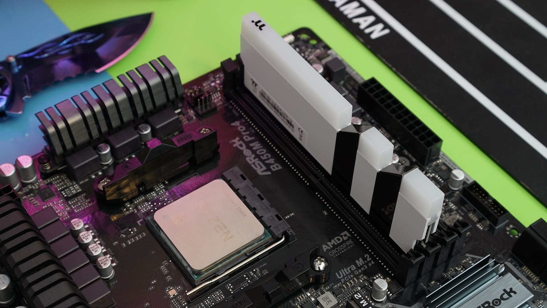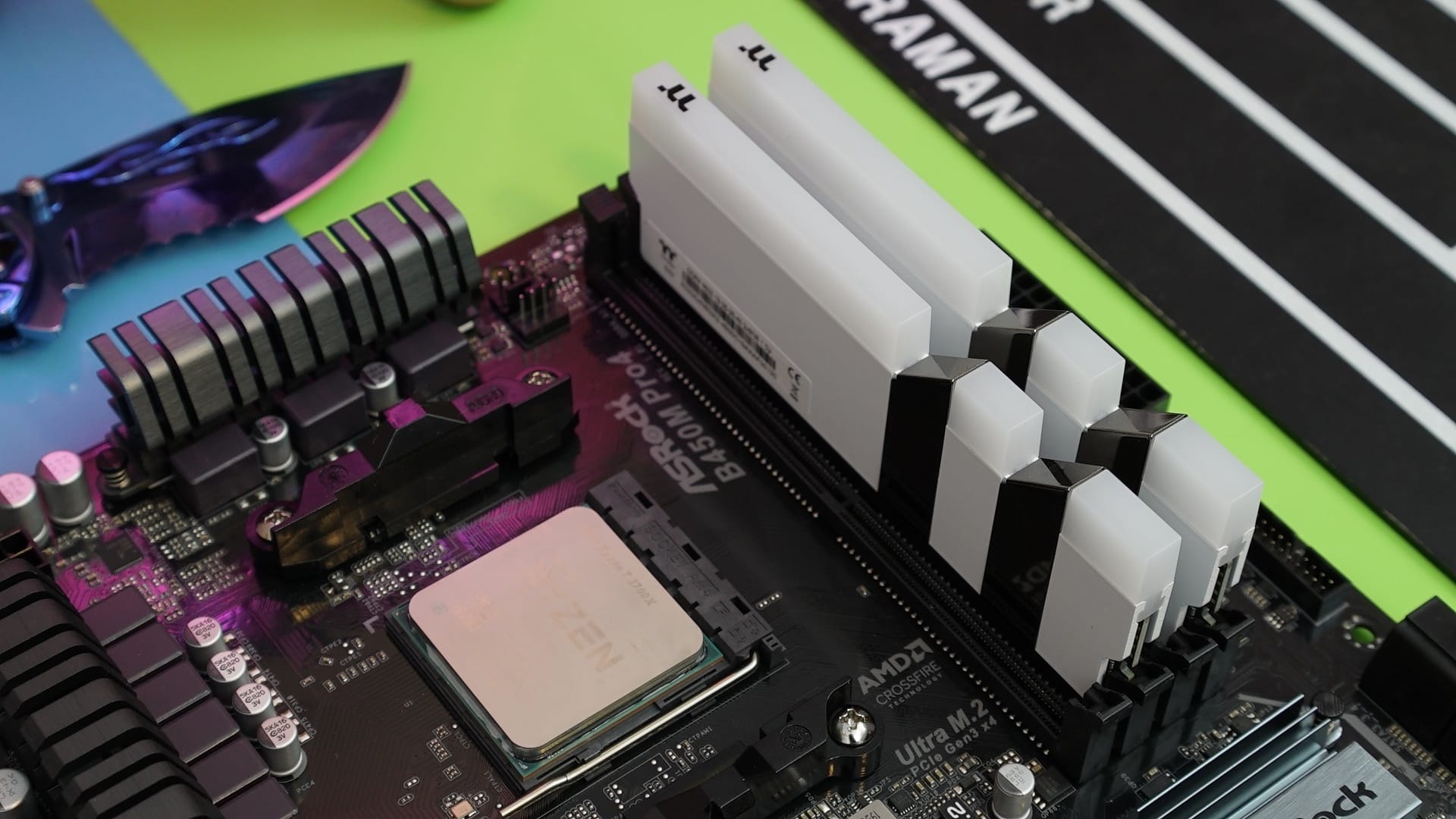 Bellek tarafında ThermalTake Toughram RGB bellekler bizlere eşlik ediyor. Ekran kartı gibi bembeyaz yapıda gelen bu şık RAM'ler iki adet 8GB modülden 16GB kurulumla geliyor. Bellekler frekans tarafında OC desteği ile birlikte 3600MHz saat hızlarına çıkabiliyor. Ayrıca gecikme tarafında CL18 değerlerini görüyoruz.