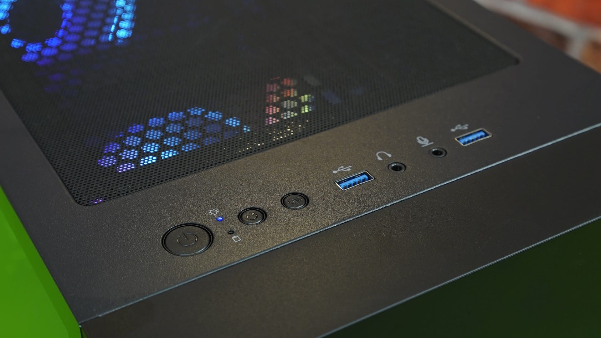 Aerocool Atomic'in üst paneline baktığımızda düğmeler ve giriş çıkışlar göze çarpıyor. Bu noktada sırasıyla güç tuşu, reset tuşu, aydınlatma tuşu, USB yuvaları ve mikrofon-kulaklık girişleri konumlandırılmış. Standart bir ön panelden bekleneni sunan bu giriş çıkışlar bizim için gayet yeterli. Üst bölümde bir diğer detay, mesh ızgara.