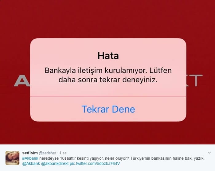 Şuanda Akbank'ın web sitesine girmeye çalıştığınızda 500 Internal Server hatası alındığı gibi, alışverişlerde Akbank kartları kullanan kişilerin 'İşlem hatası: 0000' ve 'İşlem onaylanmadı' hataları ile karşılaşılıyor.