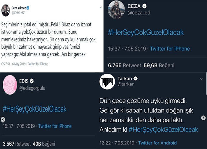 İstanbul Büyük Şehir başkan adayı olan Ekrem İmamoğlu'nun elinden mazbatası alınması ve seçimlerin yeniden yapılması kararının üzerine sosyal medyadan onlarca sanatçıdan Ekrem İmamoğlu'na destek geldi. Ekrem İmamoğlu'nun ve destekçilerinin sloganı olan "Her şey güzel olacak" sözü YSK'nın aldığı karar üzerine sosyal medya da herkes tarafından paylaşılmaya başlandı.