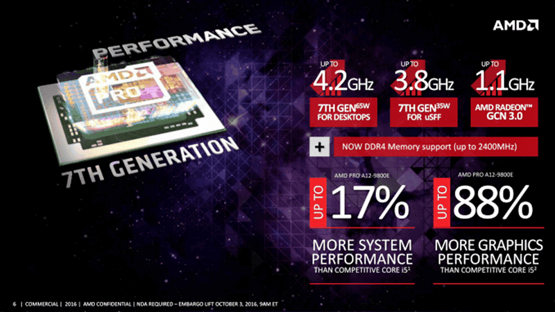 Yeni işlemciler iş gereksinimlerini karşılayabilmek adına PRO APU'lar ile arttırılmış işlem ve grafik performansı vaat ediyor. Aynı zamanda iyileştirilmiş enerji verimliliği sunduğu gibi, BT sektöründe yatırımları koruyabilmek için güvenli bir platform sunuyor.