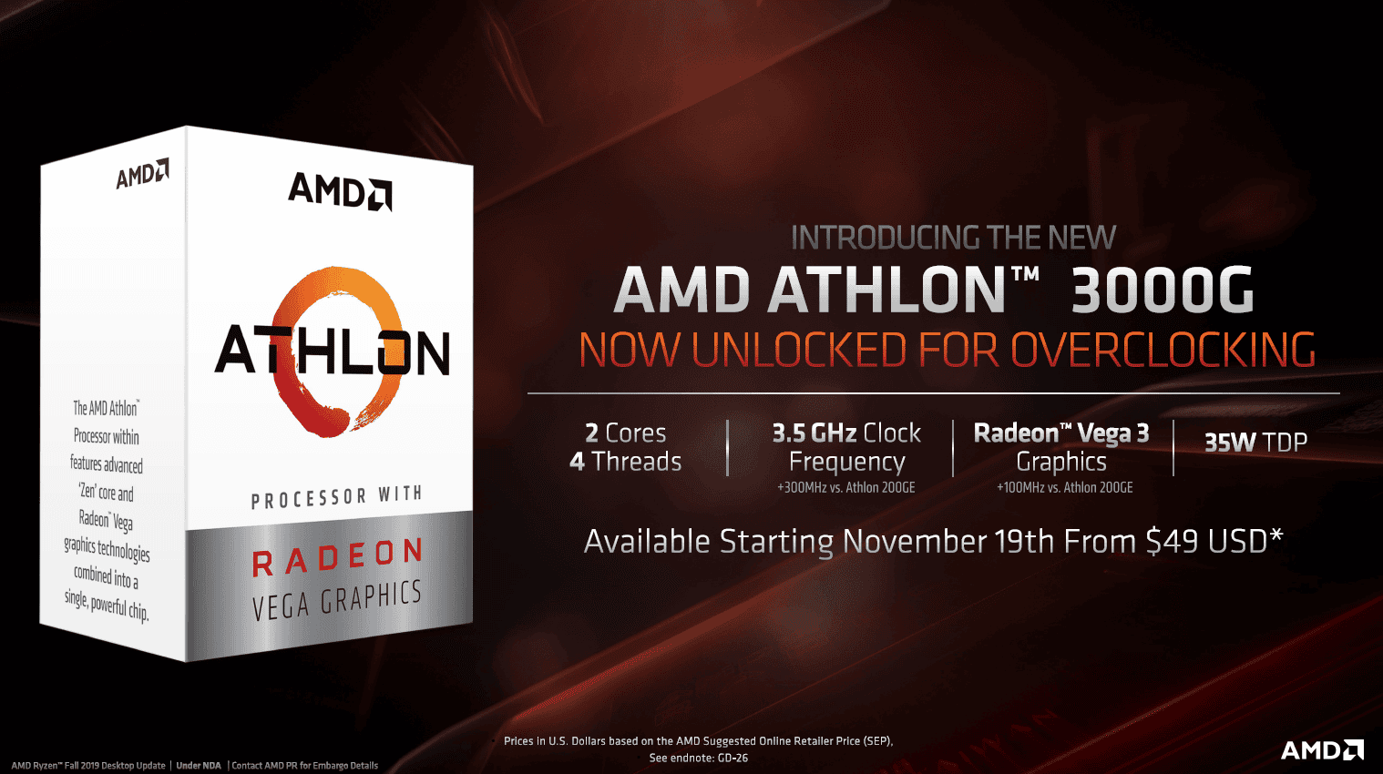 Ekran kartı olmadan "belli seviye ve performanslarda" bizlere ekran kartı ihtiyacı hissettirmeden hem işlemci hem de grafik mimarisini içerisinde barındıran APU serisi de yenilendi. AMD Athlon 3000G ismi ile piyasaya sürülecek olan bu model, 49 dolar fiyat etiketine sahip olacak.