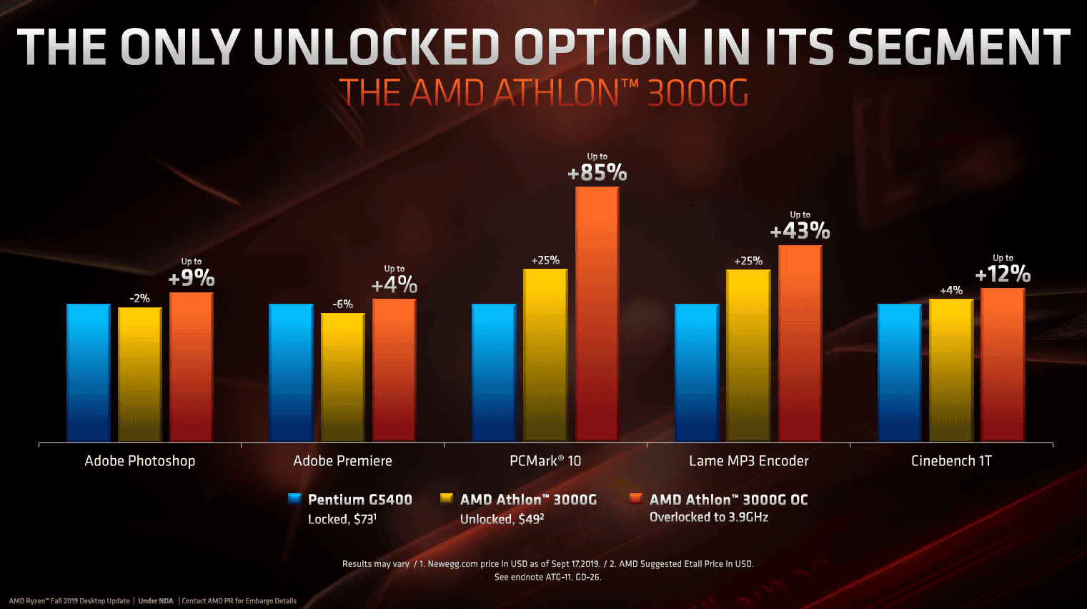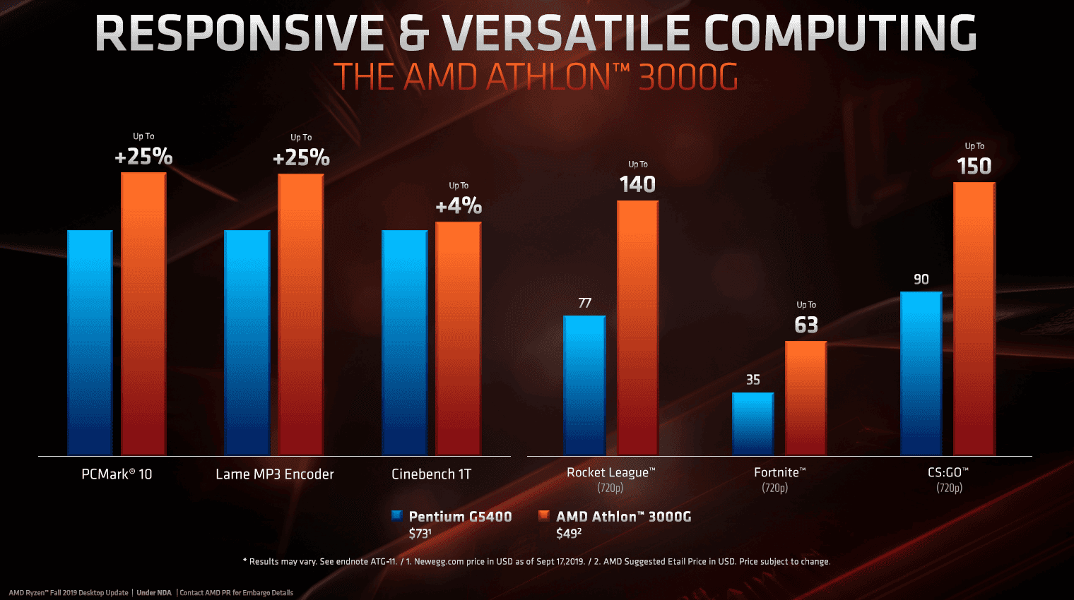 AMD Athlon 3000G APU modeli Intel G5400 versiyonu ile kıyaslanmış. Intel G5400 piyasada 73 dolar fiyat etiketine sahipken, Athlon 3000G 49 dolar ile piyasaya sürülerek yine Intel'in burada önüne geçiyor.