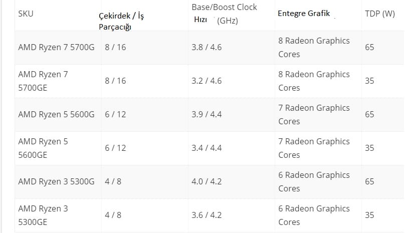 Ryzen 7 5700G 65W'lık bir yonga, Ryzen 7 5700GE ise 35TDP'ye sahip. Her işlemcinin aynı zamanda bir dizi özel 'Radeon Graphics' çekirdeği yer alıyor. Bu konu hakkında herhangi bir onay bulunmasa da bu entegre GPU'lar 'Vega' mimarisine dayanıyor gibi görünüyor.