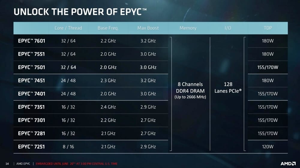 AMD EPYC 7000 işlemcilerde maksimum 32 çekirdeğe kadar olan versiyonları bulunuyor. En ucuz işlemci parçası ise 400 dolardan başlayacak. En güçlü işlemci modeli ise EPYC 7601 olarak gösterilirken, piyasa satış fiyatının 4000 dolara yakın olduğu söyleniyor. Son olarak turbo moda alındığında en yüksek saat hızının 3.2 GHz'e kadar yükseldiğinin altını çizelim.