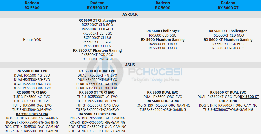 ASRock, Navi modelleri için Challenger ve Phantom serilerini piyasaya sunacak. Öteki tarafta EVO, TUF, DUAL ve ROG STRIX serilerinin de dört adet farklı SKU'su ASUS tarafından piyasaya sürülecek.