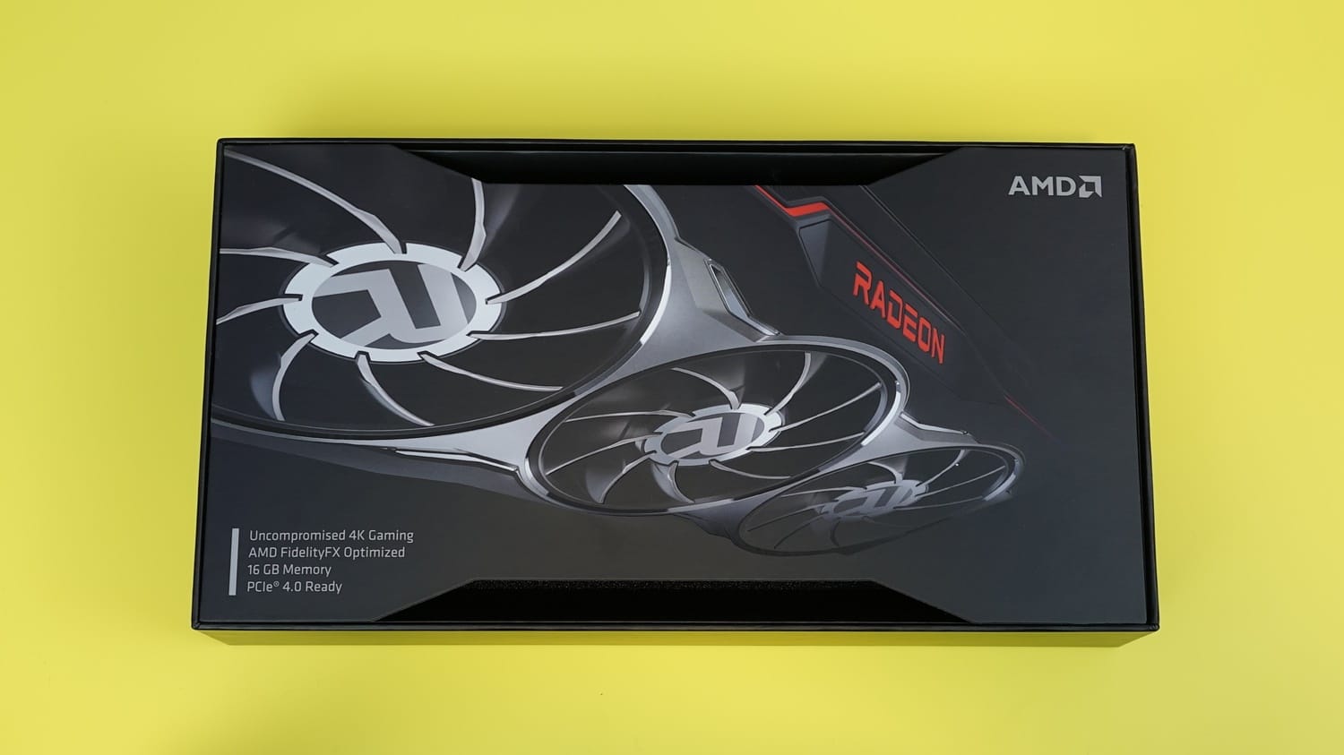 Elimizde bulunan model, herhangi bir ekran kartı firmasının ürettiği model değil. Doğrudan AMD tarafından tasarlanan Radeon RX 6800 ekran kartı ile baş başayız. Kartın son derece şık, siyah bir kutusu bulunuyor. Sol üst köşede AMD logosu dikkat çekerken, gövdede kartın fanlarını ve Radeon logosunu görüyoruz. Sol alt bölümde ise kartın yetenekleri hakkında çeşitli bilgiler sıralanmış.