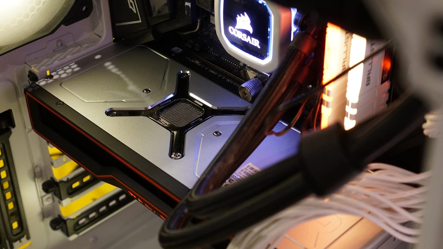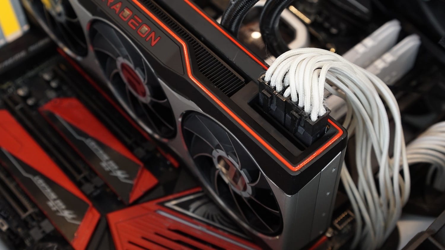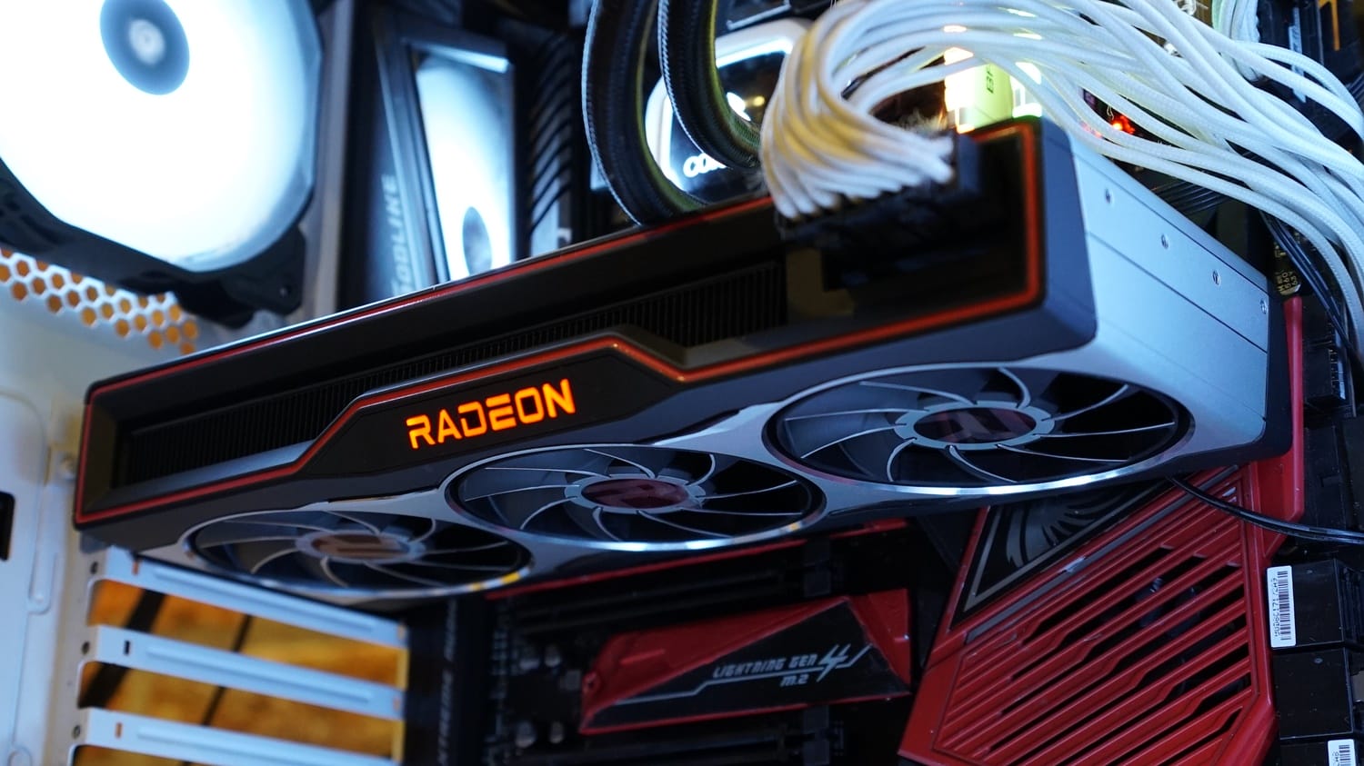 Kartın üst bölümünde daha dinamik bir tasarım gözlemliyoruz zira bu alanda göze kırmızı renk detayı çarpıyor. Orta kısımda Radeon logosu ve logonun arka kısmında ise soğutma blokunun ızgaralı göze çarpıyor. İki alanı içine katan sınır çizgileri de aynı şekide kırmızı renkler detaylandırılmış. Spor arabaların arka stoplarını anımsatan bu tasarım, kart üzerinde son derece şık durmuş. Radeon ibaresinin kırmızı aydınlatmalara sahip olduğunu da belirtelim.