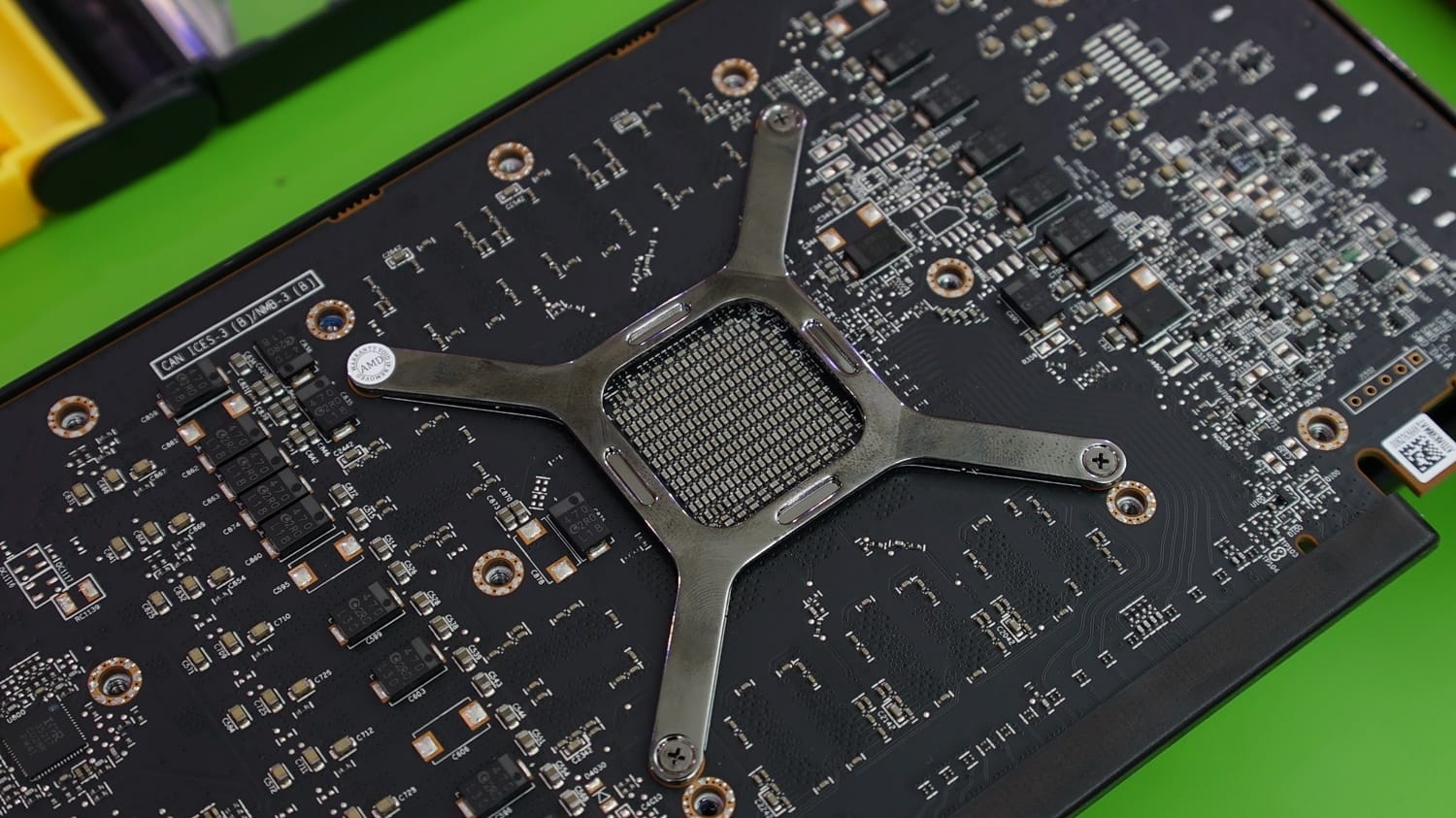 Ekran kartının içerdiği termal tasarımı yakından görebilmek adına iç kısma giriş yapmamız gerekiyor. Arka plakada bulunan dört vidanın sökülmesiyle ulaşabildiğimiz soğutma sistemi, AMD'nin soğutma performansına ne denli özen gösterdiğini bizlere sunuyor. Bu alanda kartı bloklarına ayırdığımızda soğutma bloku, PCB ve soğutmaya destek sunan ek detaylar bizleri karşılıyor.