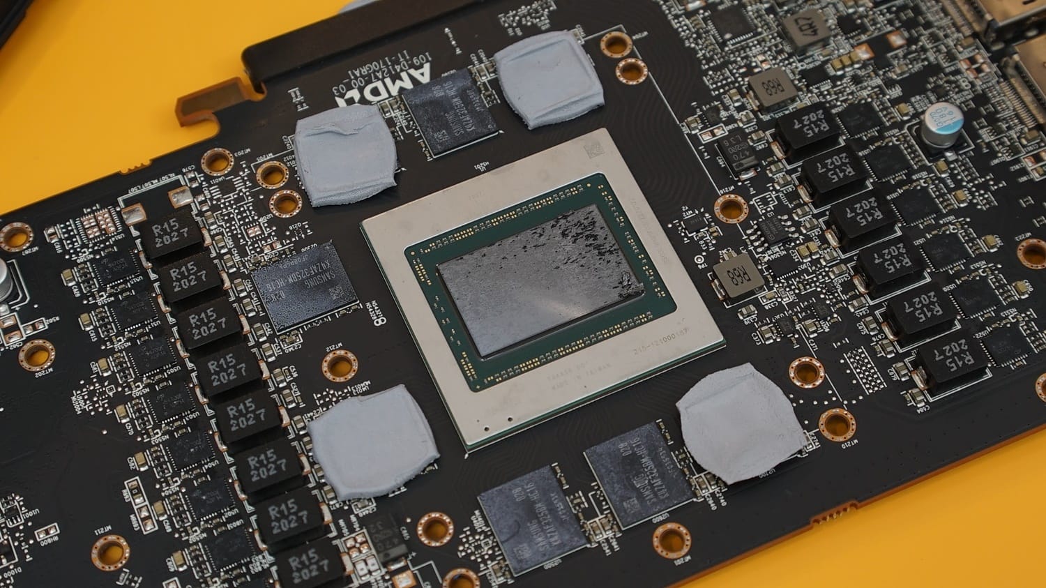 Termal tasarımda dikkat çeken en önemli nokta, PCB üzerine yerleştirilmiş termal pedler oluyor. Bu noktada VRM, mofset, bellek ve kapasitörlerin neredeyse tamamı, soğutmanın daha verimli ve etkili gerçekleşmesi adına termal pedler ile örtülmüş. Esasen önceki nesillerde iç yapıda sadece GPU üzerinde tek bir termal macun görürdük. Ancak artan sıcaklık değerlerini dengeleyebilmek için daha fazla noktada soğutma çalışması gerekiyor. Bu alanda da AMD, PCB üzerinde fazla ısınan noktalara termal pedler ile müdahalede bulunmuş.