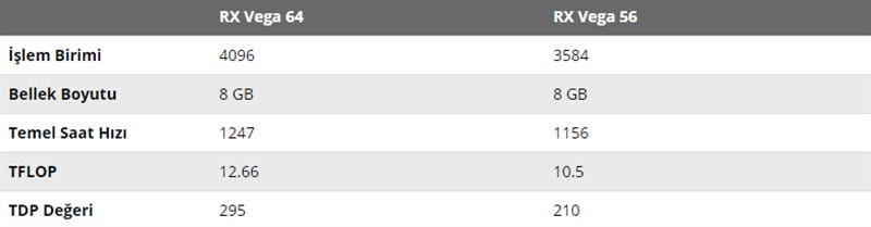Genel itibariyle özellikler böyle. Lakin bazı modeller ile özellikler artıyor. Örnek olarak RX Vega 64 sıvı soğutmalı modelinde 345W TDP değerine sahip. Yine aynı şekilde RX Vega 64 sıvı soğutmalı modelinde saat hızı, 1406 mhz olarak geliyor. RX Vega 64 Liquid fiyatı 699 dolar iken RX Vega 64 modeli ise 599 dolar bir fiyata sahip.