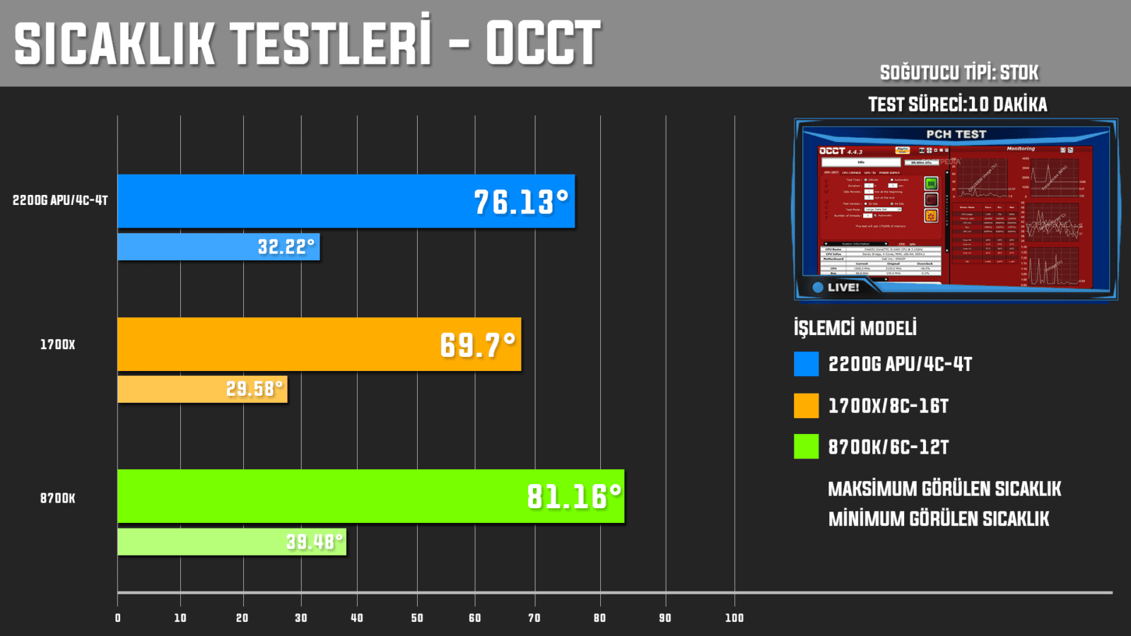 AMD Ryzen 3 2200G APU işlemcimizin normal çalışma frekansı 3.5GHz olarak ölçülüyor. Bu hızda tam güç çalışırken gerçekleştirdiğimiz 3 dakikalık OCTT testinde ise ısımız en yüksek 78 derece olarak ölçüldü. Daha sonra işlemcimizin hızını 3.9GHz'e yükselttik. Bu hızda tam güç çalışmada ise işlemcimiz 3 dakikalık OCTT testinde en yüksek 85 dereceyi gördü. Bu testte OCTT programı işlemci testini işlemciyi zorlamamak adına durdurduğunu da belirtelim.