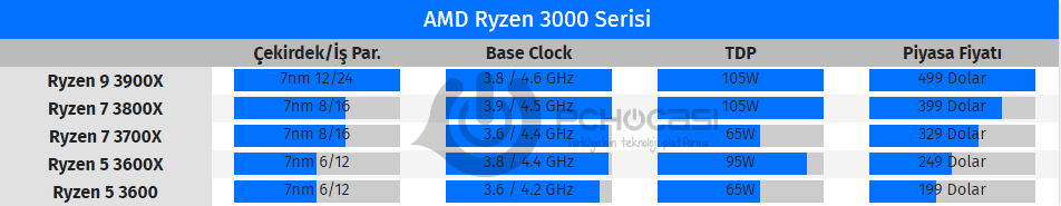Bugün AMD yeni Ryzen 3000 serisi işlemcilerini duyurdu. Çok beklediğimiz yeni seri, Computex 2019 öncesi tanıtıldı. Modeller 499 dolardan başlayarak, 12 çekirdekli ve 24 iş parçacığına sahip. 105W TDP'nin yanı sıra, en güçlü modeli Ryzen 9 3900X olarak ortaya çıktı.