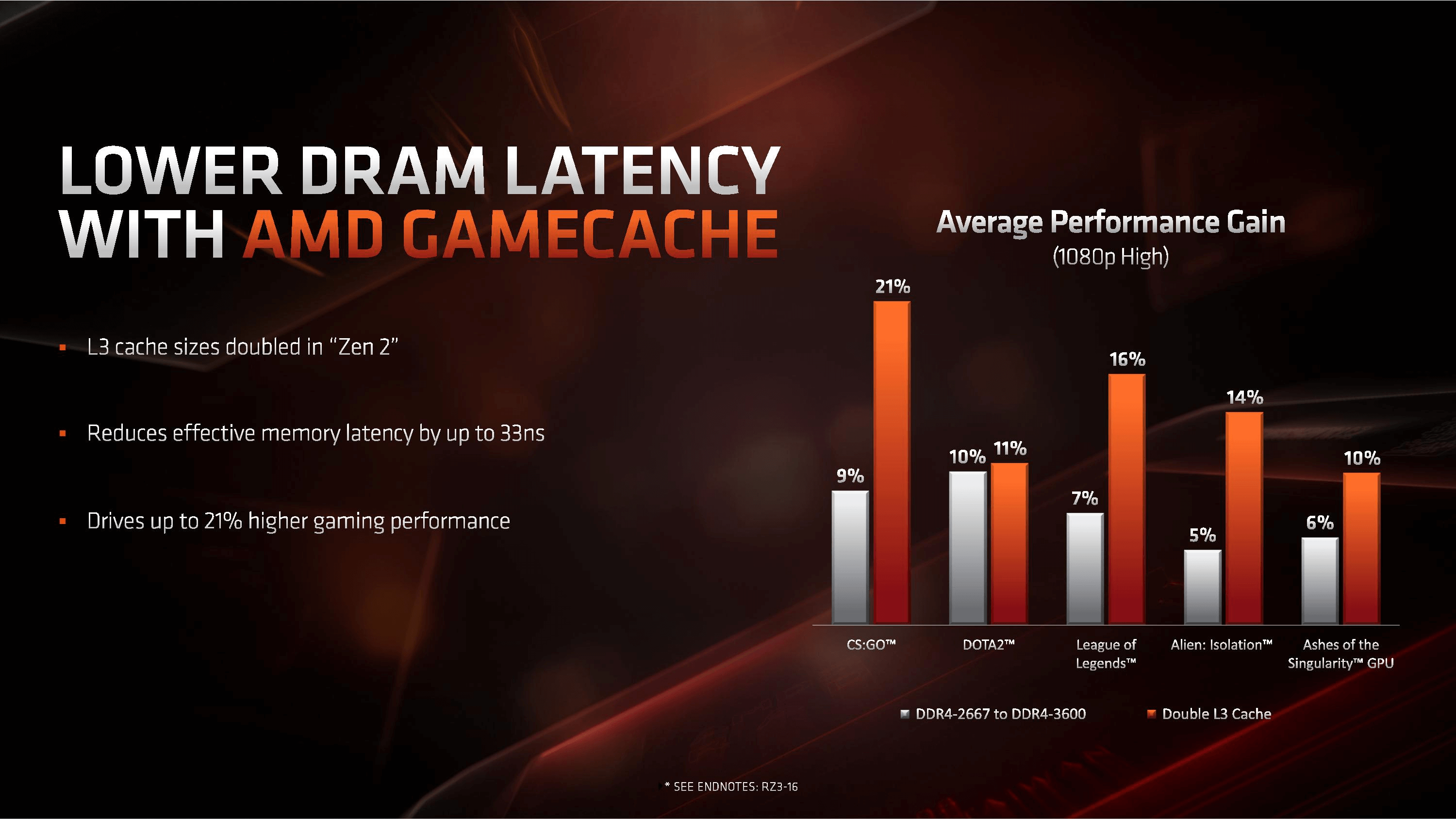 GameCache adı verilen bu yüksek L3 ön bellek tasarımı, ciddi oranda artan ve modele göre 64MB'a kadar yükselen bir değer konumunda. Ayrıca AMD, tek başına ön bellek arttırımından ziyade belleğe erişim süresinde de geliştirmeler gerçekleştirmiş. Bu noktada da %10 oranına kadar düşen bir gecikme oranı yeni nesil Ryzen işlemcilerde bulunuyor.