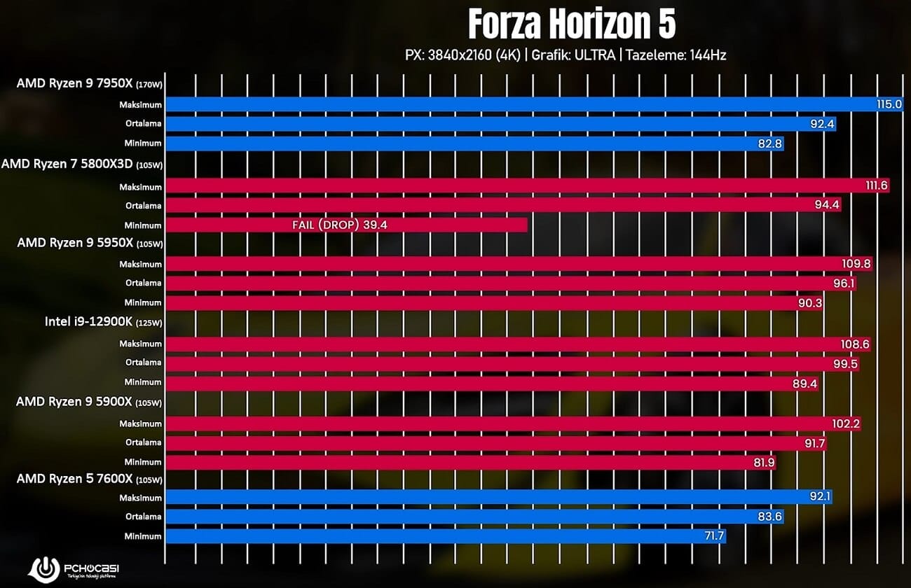 Gelelim oyun testlerine. Yine Intel ve AMD arasında ciddi bir çarpışma olan bölümlerden biri oldu.Forza Horizon 5 - 4K Ultra