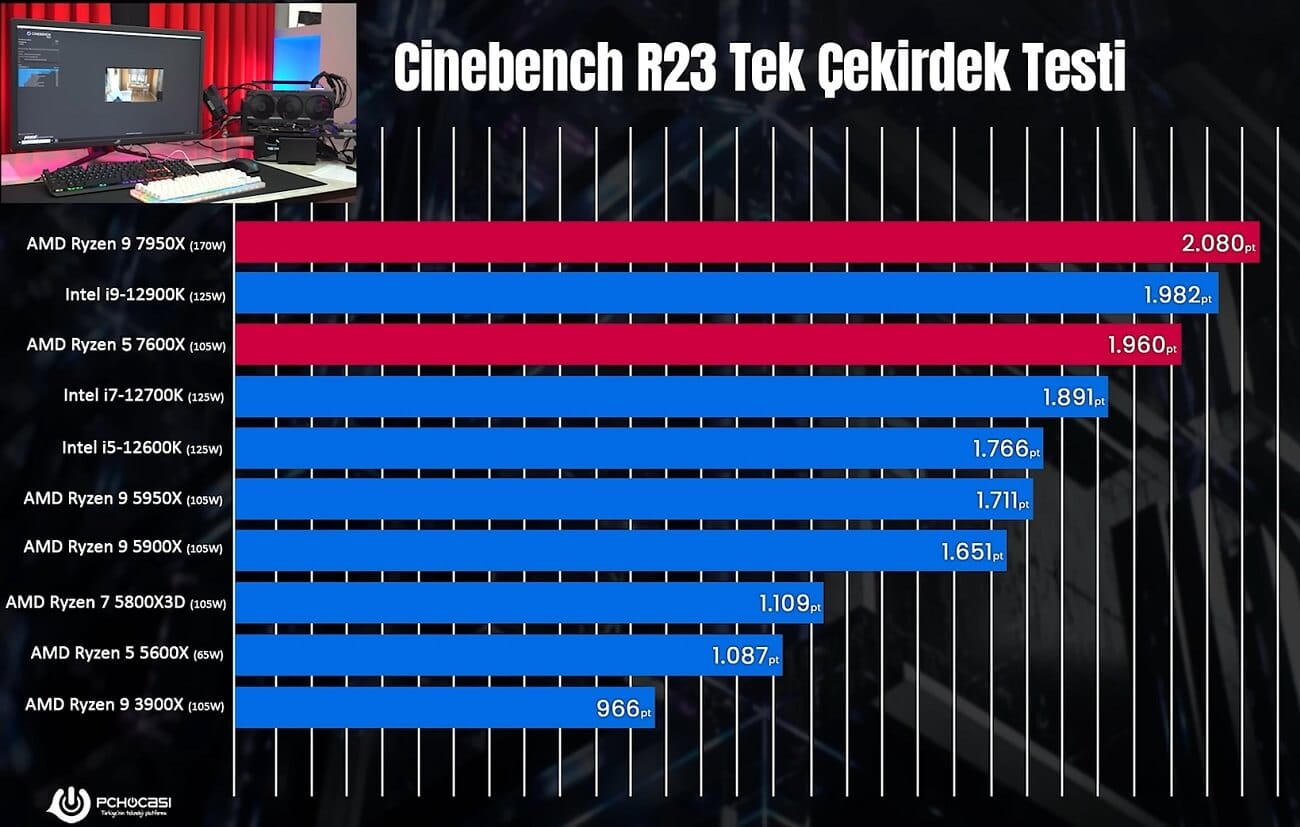 İşte tek çekirdek performansının nasıl değiştiğini gördüğümüz ana test bu oldu. Ryzen 9 7950X testte zirvede. 2.080 puan ile liderliği koruyor. Asıl dikkat çeken ise Ryzen 5 7600X. Burada 7600X modelinin aldığı skor 1.960 olarak belirlendi. Intel i9-12900K aynı test sırasında 1.982 puan alarak aslında ne kadar yakın sonuçlar elde edildiğini de göstermiş oldu.