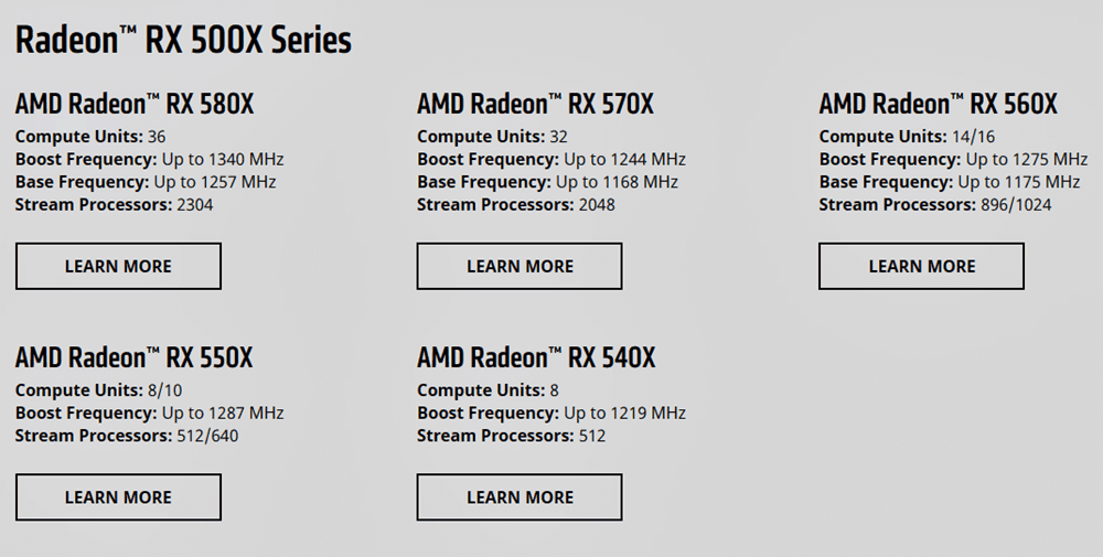 Şuanda AMD'nin web sitesinde yayınlanan modeller şu şekilde:
