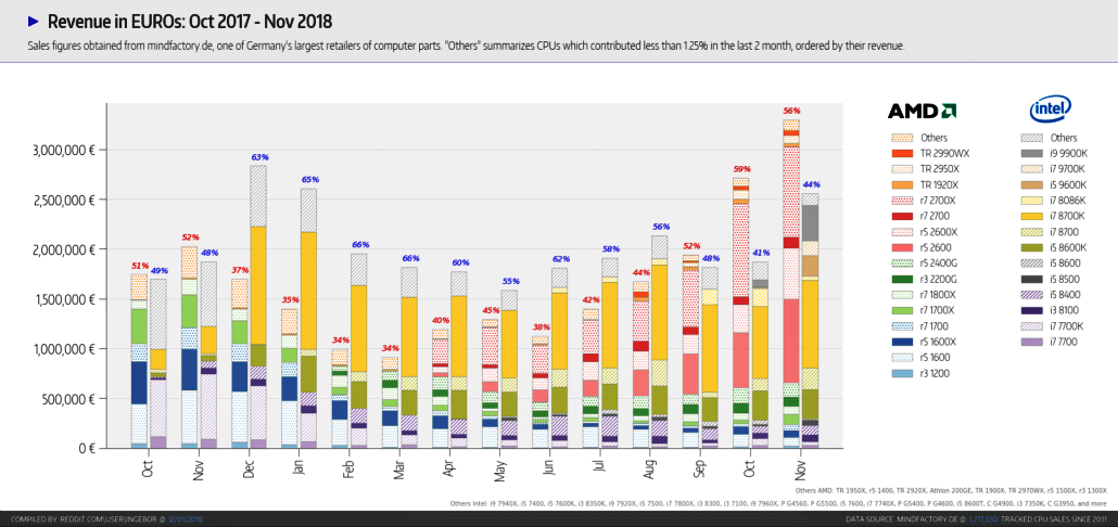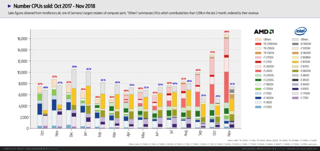 Kasım ayı içerisinde AMD en büyük rakibi Intel'e göre tarihi bir satış rekoruna erişti. Almanya'nın en büyük e-ticaret perakendecisi olan Mindfactory sitesi, AMD'nin satış rakamlarını grafiğe dökerek internette paylaştı. Rekor kıran bu CPU satış furyası, hala artmaya devam ediyor.