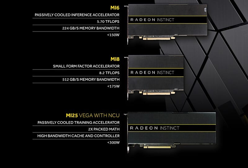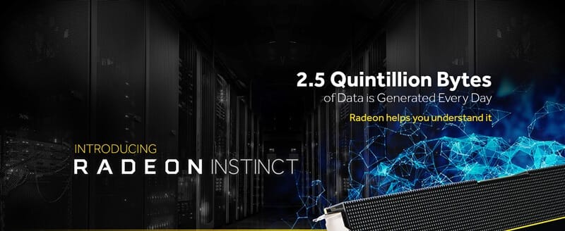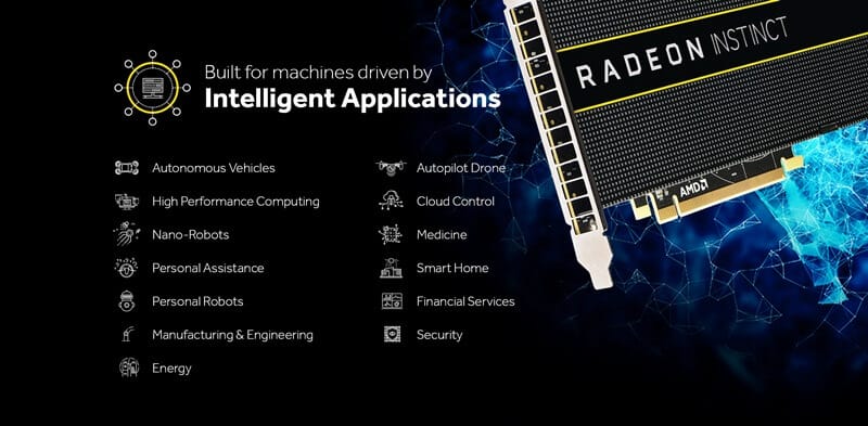 AMD bu seride yapay zeka açık yazılım ekosistemi için güzel bir tasarım ortaya çıkartmış. Radeon Instinct adı verilen bu seride, algoritma eğitiminin hızlandırılmasına yardımcı olduğu gibi, pasif soğutma, SR-IOV endüstri standartları ile uyumlu AMD MultiGPU donanım sanallaştırma teknolojisi ve çoklu GPU uçtan uca destek için 64 bit PCIe adresleme yapabiliyor.