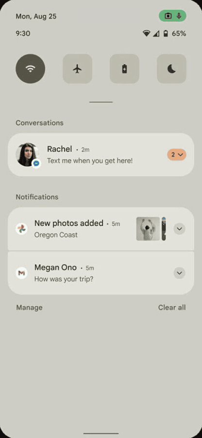 Yeni bildirim kullanıcı arayüzünden bahsedecek olursak, Android 12 güncellemesi, arka planı açık bej renkli olacak bildirim paneli için yeni bir kullanıcı arayüzü içerecek. Bildirimler paneli, mevcut kullanıcı arayüzünün şeffaf arka planına karşı opak olacak ve kamera ve mikrofon için gizlilik göstergeleri ve tarih ve saatin konumunu değiştirebilme özelliği, bildirimlerde yuvarlak köşeler içerecektir.
