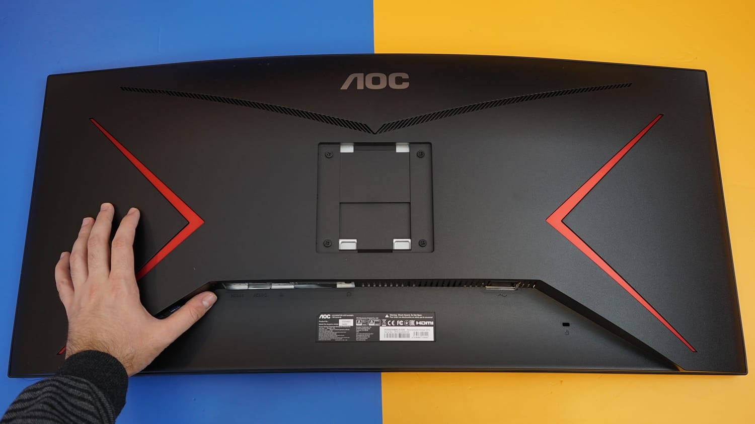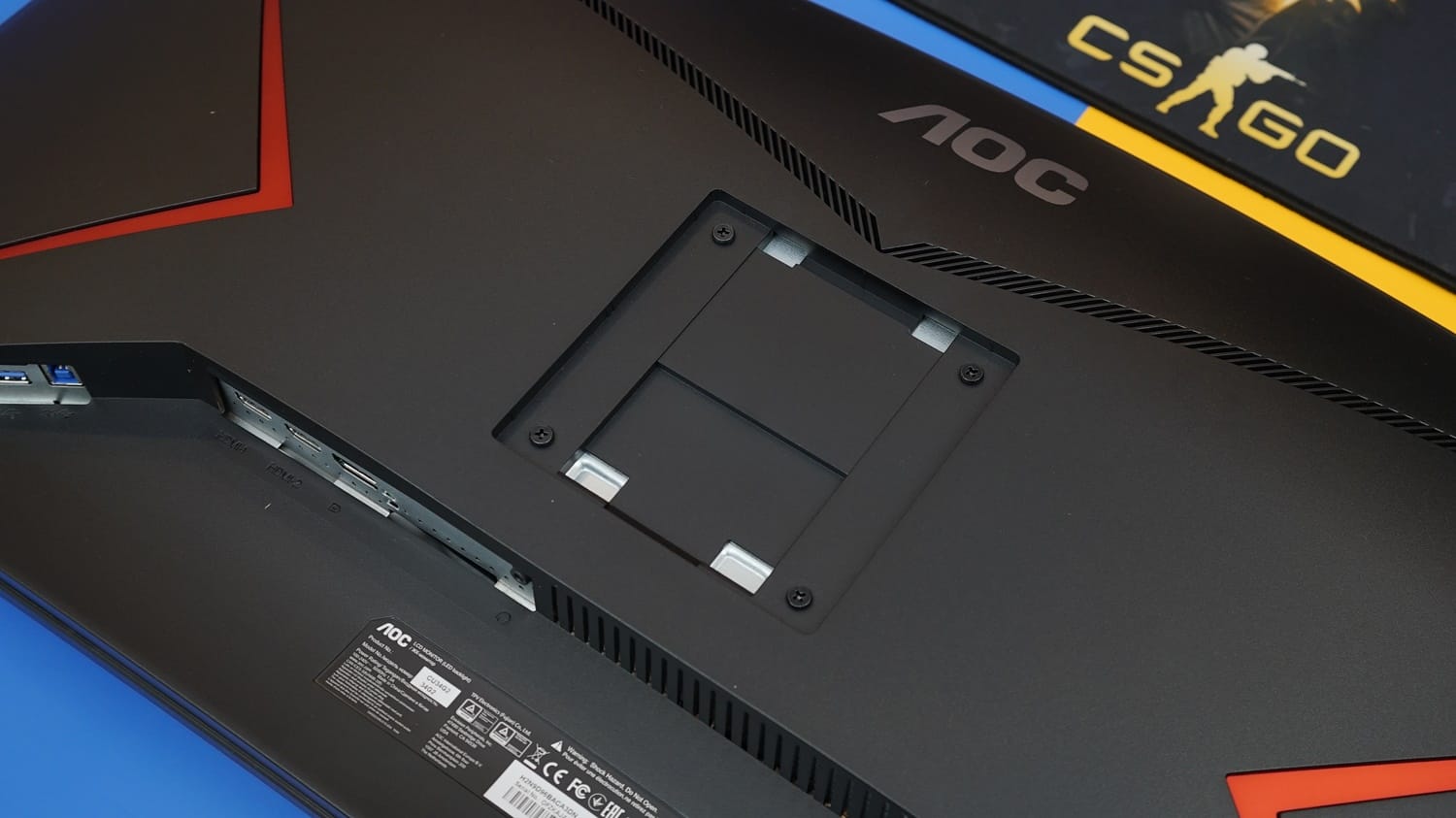 Ürünün arkasına baktığımızda yine orta üst bölümde AOC logosu bulunurken, her iki yan kenara kırmızı şeritler konumlandırılmış. Monitörün bağlantı girişleri ise ortanın altında panele paralel olacak şekilde alttan yukarı olarak konumlandırılmış.