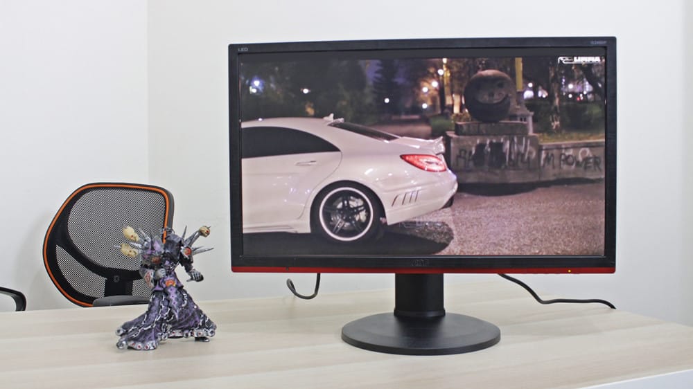 Monitörümüzün tasarımından başlayacak olursak; siyah yoğun renk ile tasarlanmış 24" bir panel karşımıza çıkıyor. Alt çerçevenin ise kırmızı renkli dizayn edildiğini görüyoruz. Günümüz oyun donanımının simge rengi olan kırmızı, hem monitörün hakkında bizlere bilgi veriyor hem de şık görüntüsüne estetik bir hava katıyor.