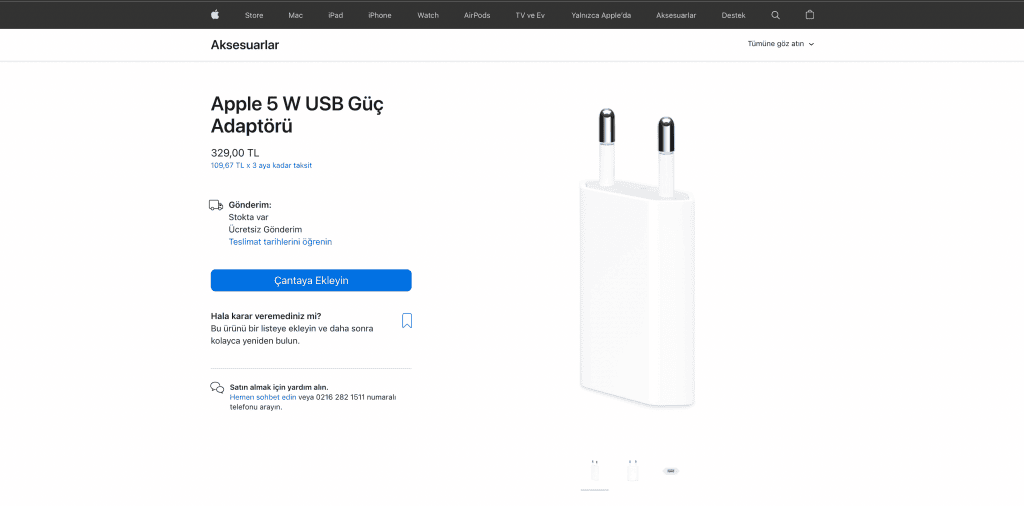 Apple'ın Türkiye mağazasına girdiğimiz zaman Apple 5W USB Güç Adaptörü başlıklı ürün 329 Türk Lirası fiyat etiketiyle halen daha satışta görünüyor. Görünen o ki şirket zaman içerisinde bu ürünü ülkemizde dahil olmak üzere dünya çapında satıştan kaldırmayı planlıyor.