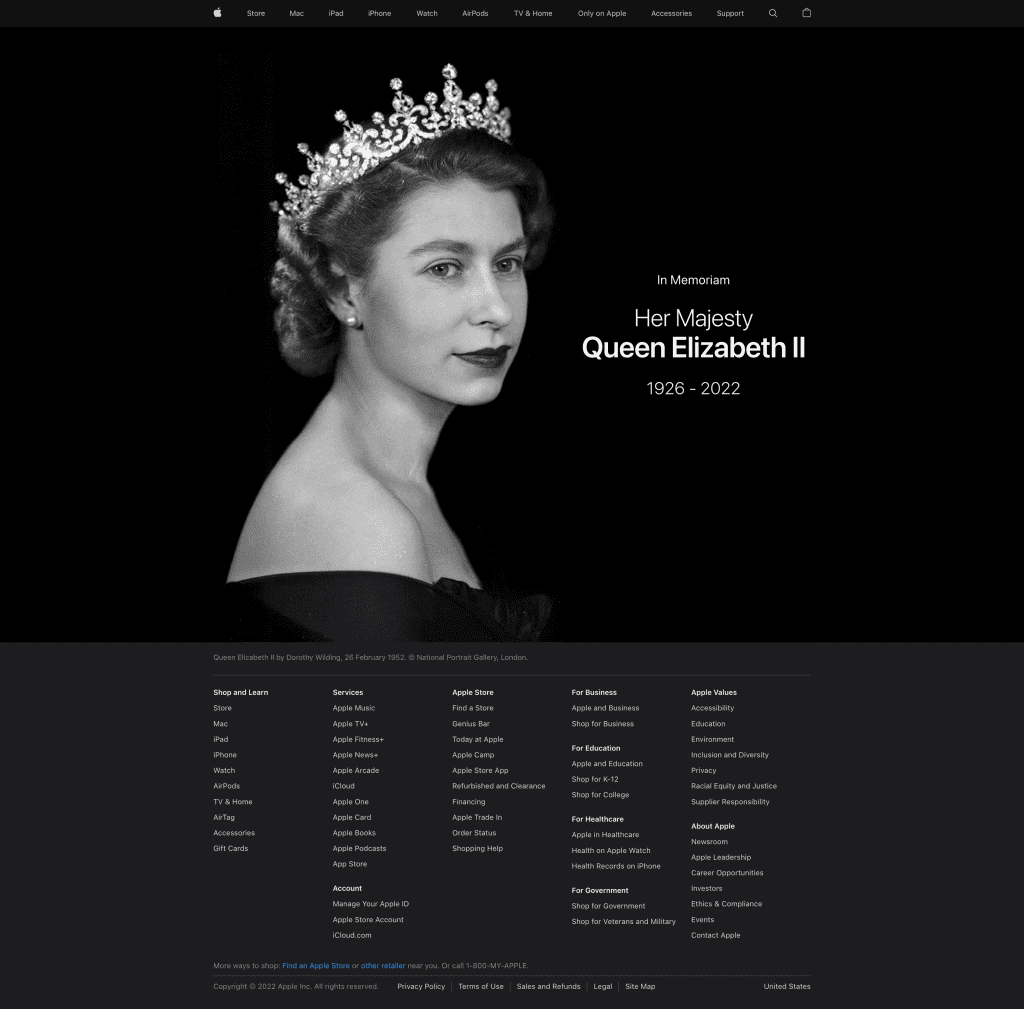 Amerika Birleşik Devletleri merkezli yazılım ve teknoloji devi Apple ise, bu konuya kayıtsız kalmadı ve Kraliçe II. Elizabeth'in anısına web sitesini bir süreliğine siyaha bürüdü ve ana sayfasına Kraliçe II. Elizabeth'i koyma kararı kaldı.