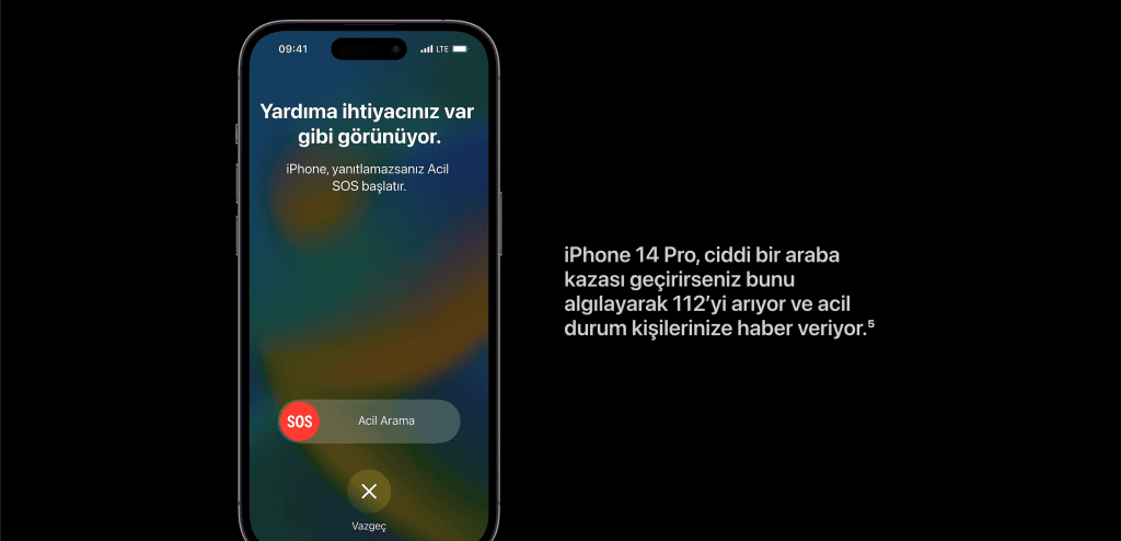 Hem iPhone 14 Pro ve hemde Apple Watch Ultra modellerinde yer alan bu özellik; bir trafik kazası geçirdiğiniz zaman acil yardım servislerine sizin yerinize bildirim gönderiyor ve arıyor. Böylelikle aramaya vaktiniz olmadığında ya da arama yapamacak duruma geldiğinizde telefonunuz/saatiniz size yardımcı oluyor.
