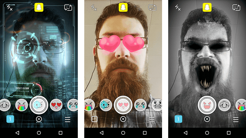 Popüler uygulamada yeni güncelleme ile bir çok efekt bulunuyor. Snapchat'i açtıktan sonra ön kameradan kendinizi görmeye başladıysanız yüzünüzün ortasına iki saniye basılı tuttuğunuzda aşağıdaki efektler de görünecektir. Ardından tek tek bu efektleri deneyebilir, aynı zamanda eğlenebilirsiniz.