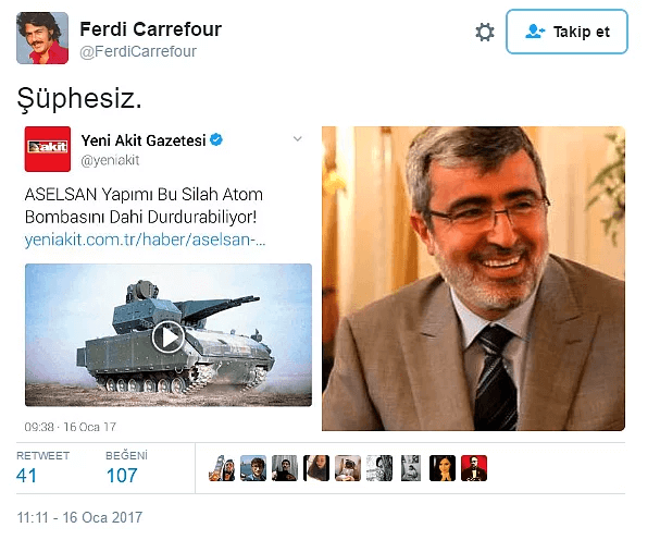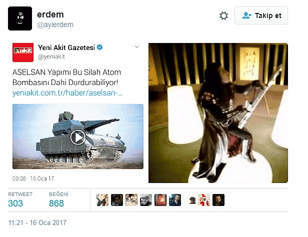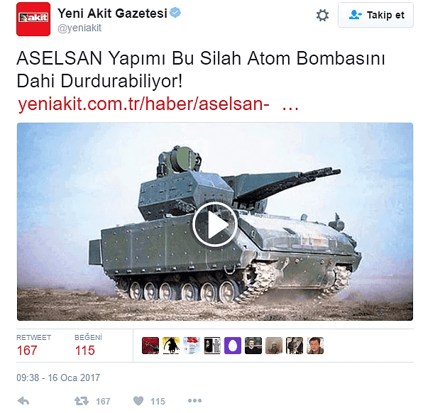 Bir kaç saat önce Yeni Akit tarafından atılan bir başlık herkesi şaşırttı. Başlıkta "Aselsan yapımı bu silah atom bombasını dahi durdurabiliyor" başlığı ortalığı karıştırdı. Ardından sosyal medya üzerinde büyük bir maytap başladı.