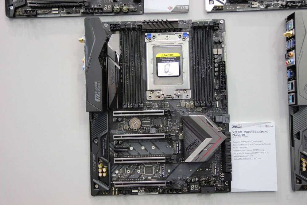 Öte yandan ASRock sadece X399 anakart serisi sergilerken, profesyonel gaming ve Taichi modelleri bizlere dört adet PCI-Express yuvasının yanı sıra, sekiz adet bellek DIMM'si sunuyor. Üstelik her iki anakartta da Wi-Fi antenleri ve iki ethernet konektörünün olduğunu görüyoruz. X399 Aorus Gaming 7 anakartından farklı olarak ASRock Ryzen Threadripper işlemci modellerine uygun olarak 8-pin güç konektörüne sahip.
