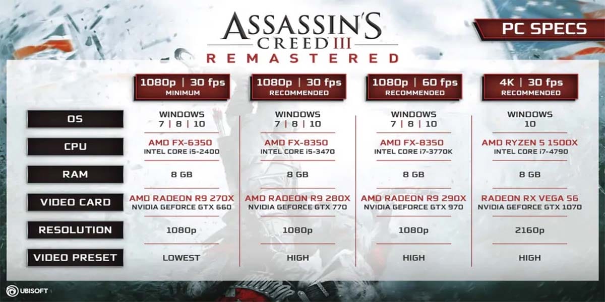 Ubisoft'un sevilen oyun serisi Assassin's Creed'in 3. oyunu, güncel grafik teknolojisine uyarlanarak bu yıl yeniden çıkış yapacak. Assassin's Creed III Remastered adı ile gelecek oyunun sistem gereksinimleri de belli oldu.