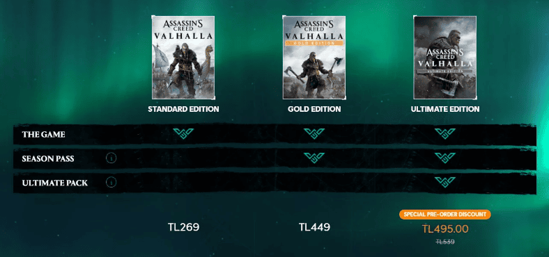 Valhalla'nın Ultimate sürümü şu anda Ubisoft mağazasında ön siparişe açık bir şekilde duruyor. Bu sürümün fiyatı ise 495 TL.