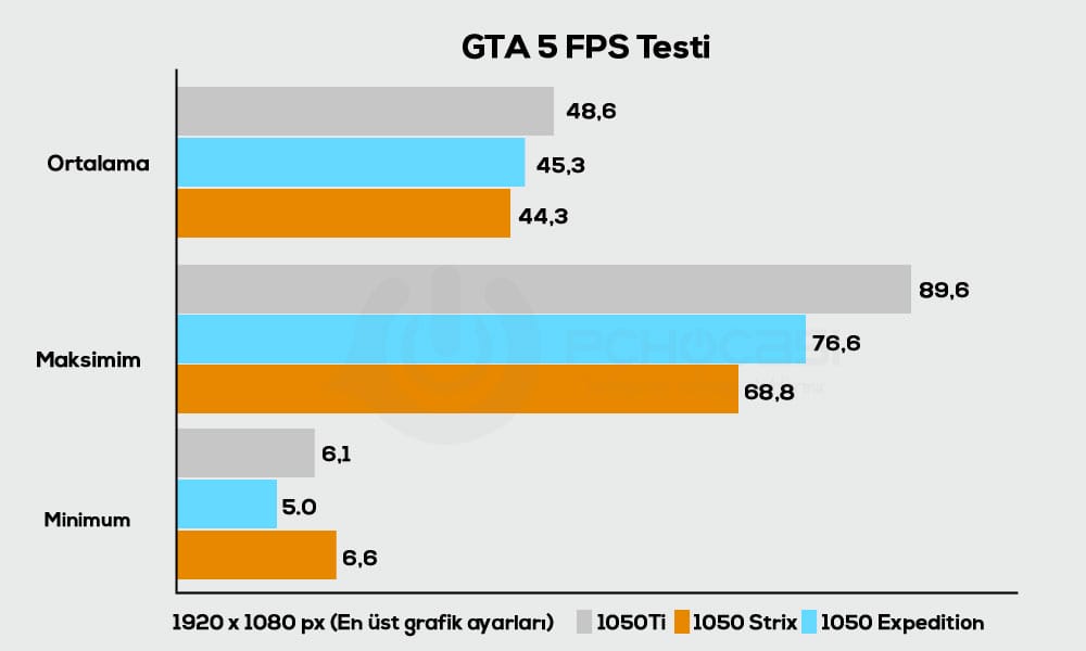 Ekran kartımızın arkasında DVI, HDMI ve DisplayPort çıkışları yer alıyor. Kolayca güncel dijital girişlerden faydalandığımız gibi, birden fazla monitörü de dahil edebiliyorsunuz. Hemen aşağıda ise GTX 1050 serisinin GTA 5'te vermiş olduğu FPS değerlerini görüyorsunuz.