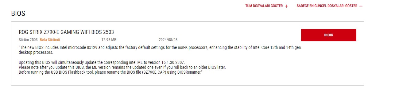 "Yeni BIOS, Intel mikro kodu 0x129'u içerir ve K olmayan işlemciler için fabrika varsayılan ayarlarını düzenleyerek Intel Core 13. ve 14. nesil masaüstü işlemcilerin kararlılığını artırır. Açıklaması ile sürüm notları arasına yerleştirilmiş.